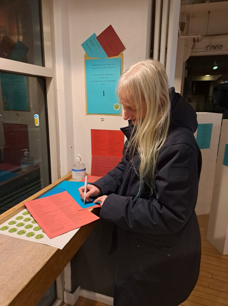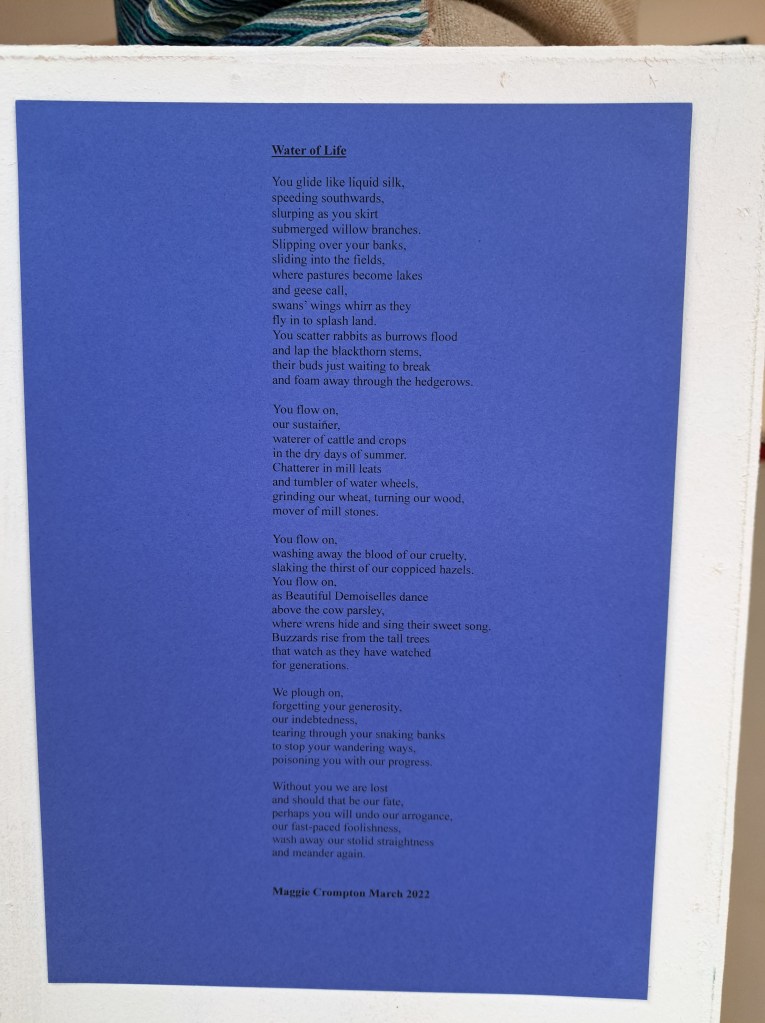 Manchester Metropolitan University invited work for an exhibition by postgraduate research students. Writer and journalist Joe Shute, who is investigating the River Irk in Manchester, and I collaborated together to perform and display poems in a piece called ‘River Voices’. We each read a poem about our respective rivers at the opening night and displayed river poems on the plinths of the sculptural piece. We had put a call out for river poems with Manchester Poetry Library and were delighted with the resulting contributions. We also invited visitors to contribute their poem during the week long exhibit at the old Cornerhouse in Manchester. With their permission I displayed the poems of the stitchers for The Lugg Embroideries, namely Robert Crompton, Maggie Crompton and Rose Tinted Rags. As well as contributing and replenishing the flow of poems, the audience were invited to take poems away during the exhibtion and the remainder left over, were later given to the Poetry Library.