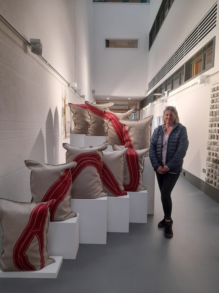 The images show the work of the 42 The Lugg Embroiderers who were stitchers from the community including the already established stitching group from Rose Tinted Rags. I also displayed poems by stitcher and poet Maggie Crompton and, a charm for the Lugg composed by Rose Tinted Rags – the illustrated poster here was made by Kirsty just after the group wrote the charm.