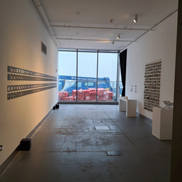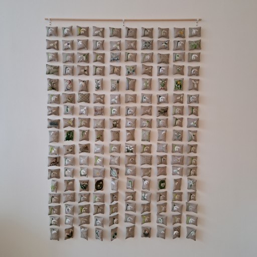 the work, I was so familiar with, in a new way. A colleague David, on the opposite wall had music as part of his installation (Debussy Arabesque No1) and this gentle music and his grid presentation matched the aesthetics of the snowdrops. I wrote about and investigated music and textiles for my masters, so this curatorial combination was particularly pleasing.