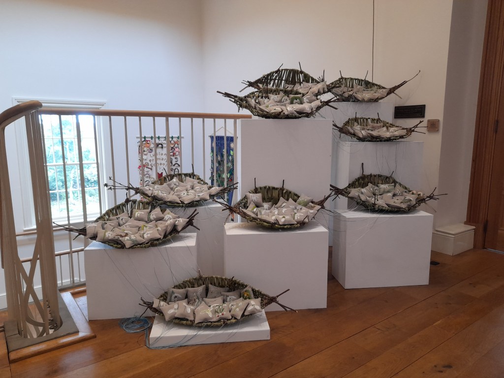 The images show the work of the 42 The Lugg Embroiderers who were stitchers from the community including the already established stitching group from Rose Tinted Rags. I also displayed poems by stitcher and poet Maggie Crompton and, a charm for the Lugg composed by Rose Tinted Rags – the illustrated poster here was made by Kirsty just after the group wrote the charm.