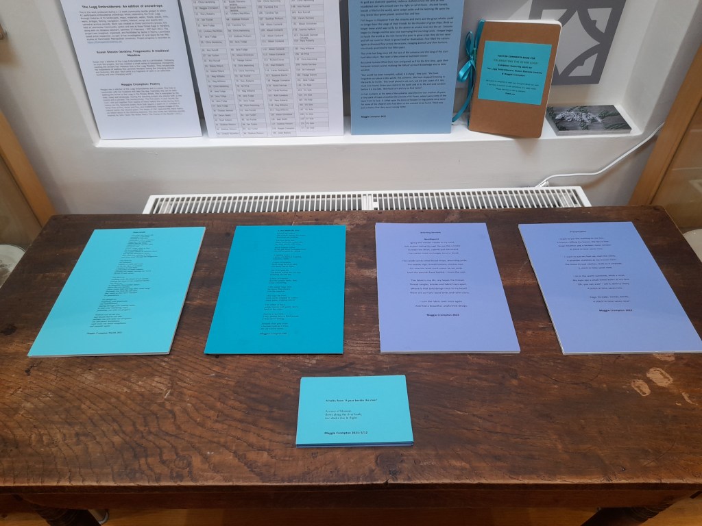 Many thanks to Maggie Crompton, the poet and Lugg Embroiderer who generously allowed me to display her wondeful poems and helped me to carry the plinths and set up the strewing baskets and snowdrops. Some four hours later….