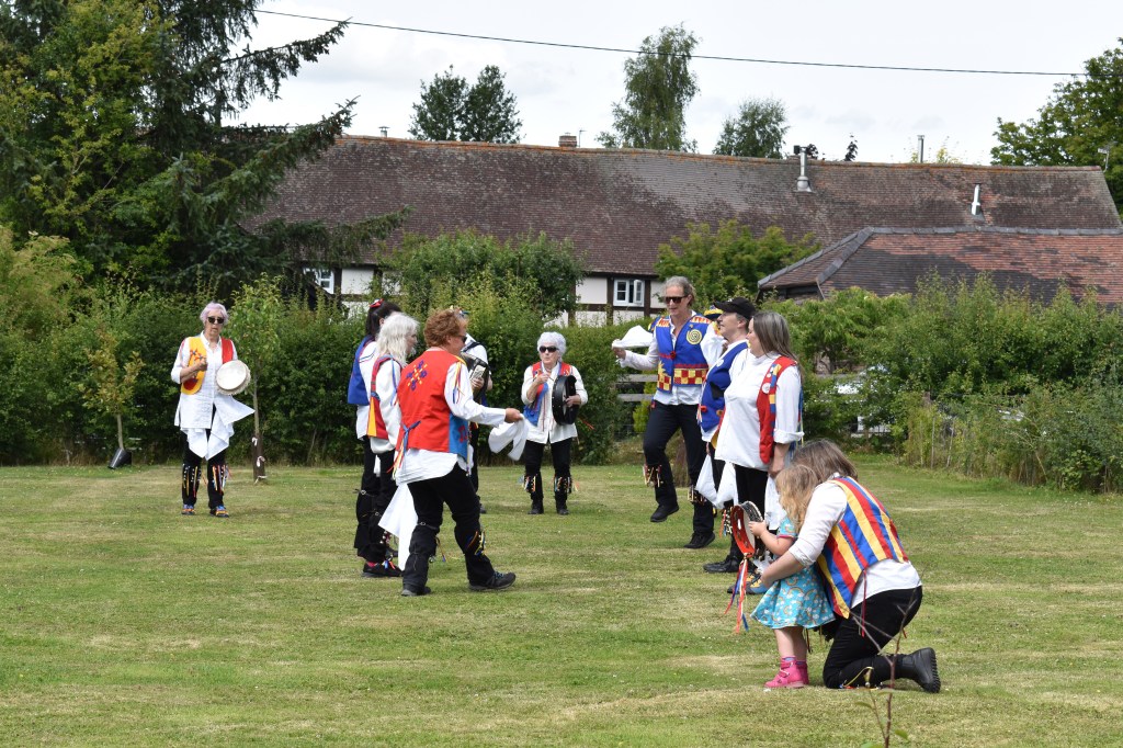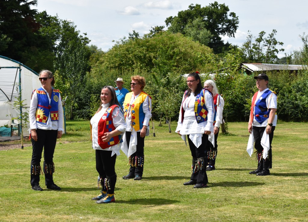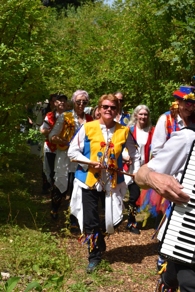 Then the Jenny Pipes Morris dancers arrived. They are named after the last woman to be ducked on Leominster’s ducking stool into the Kenwater, which is part of the River Lugg. We are pleased to say she was feisty and came up shouting even though she was ducked twice. Her crime? Scolding her husband!
