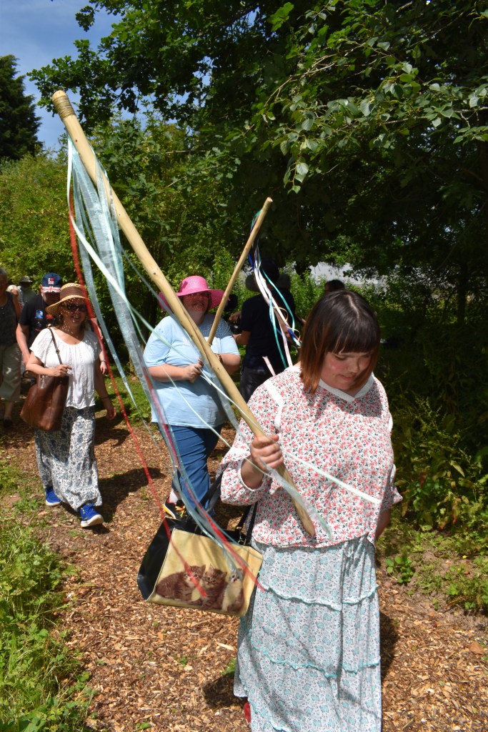 This is the celebratory event I put together with the help of many of the multi talented Lugg Embroiderers, which was kindly hosted by Echo at their beautiful Community Garden at Eaton Barn, that runs down to the Lugg. This coincided with the Mayor’s Save the Lugg Day and enabled it to be enjoyed by the public and Echo participants together. We had Jenny Pipes Morris dancers, musicians Mary, Carol and Kate, and our wonderful poets Robert and Maggie Crompton. It was all finished off with a Mayoral procession down to the Lugg, complete with a beautiful banner and our ribboned wands, with poetry readings by the Lugg by Robert and Maggie.