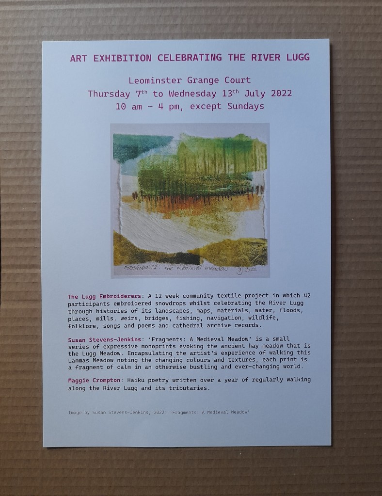 Also a big thank you to Sue Stevens-Jenkins, also a Lugg Embroiderer but also a fabulous printmaker who was introduced to and walked The Lugg Meadows by Chris, another Lugg Embroiderer, and was inspired to create this seven series of monoprints. This has led to her launching a much bigger project about these Lammas meadows, watch this space.