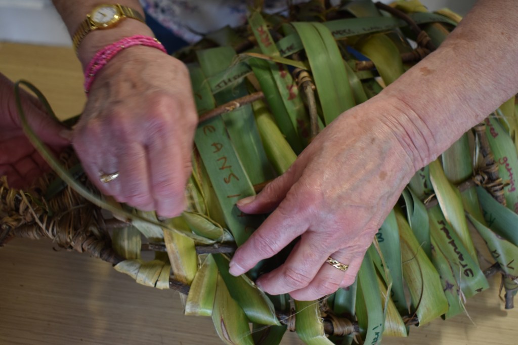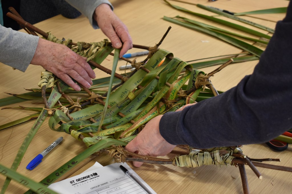 I was invited to join the Community group in Collyhurst who have been meeting, walking and sharing lunch for several years at St George’s Community Centre. Joe Shute has involved them in his research of the River Irk and that morning they were meeting to walk and to reweave the strewing baskets, that were originally made to display the Lugg Embroideries, with new leaves and words. I had a lovely morning, walking and photographing the weaving, and shared lunch, and the work will be exhibited next year alongside other re-weaving’s by other Manchester community groups as part of Joe’s project. It is fabulous to see the basket boats repurposed and metaphorically linking the River Lugg with the River Irk. There was a magical moment when the group broke out into a local folk song.