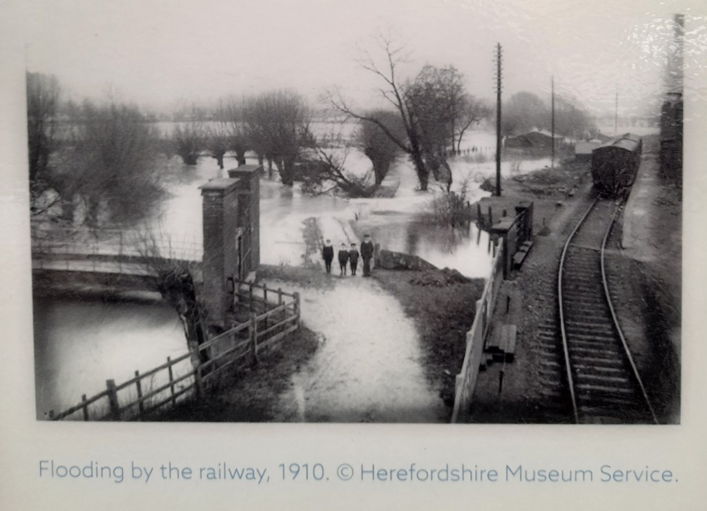 Photo of the Lugg flooding in 1910 by Leominster Railway Station, seen on Heritage board at Leominster station today