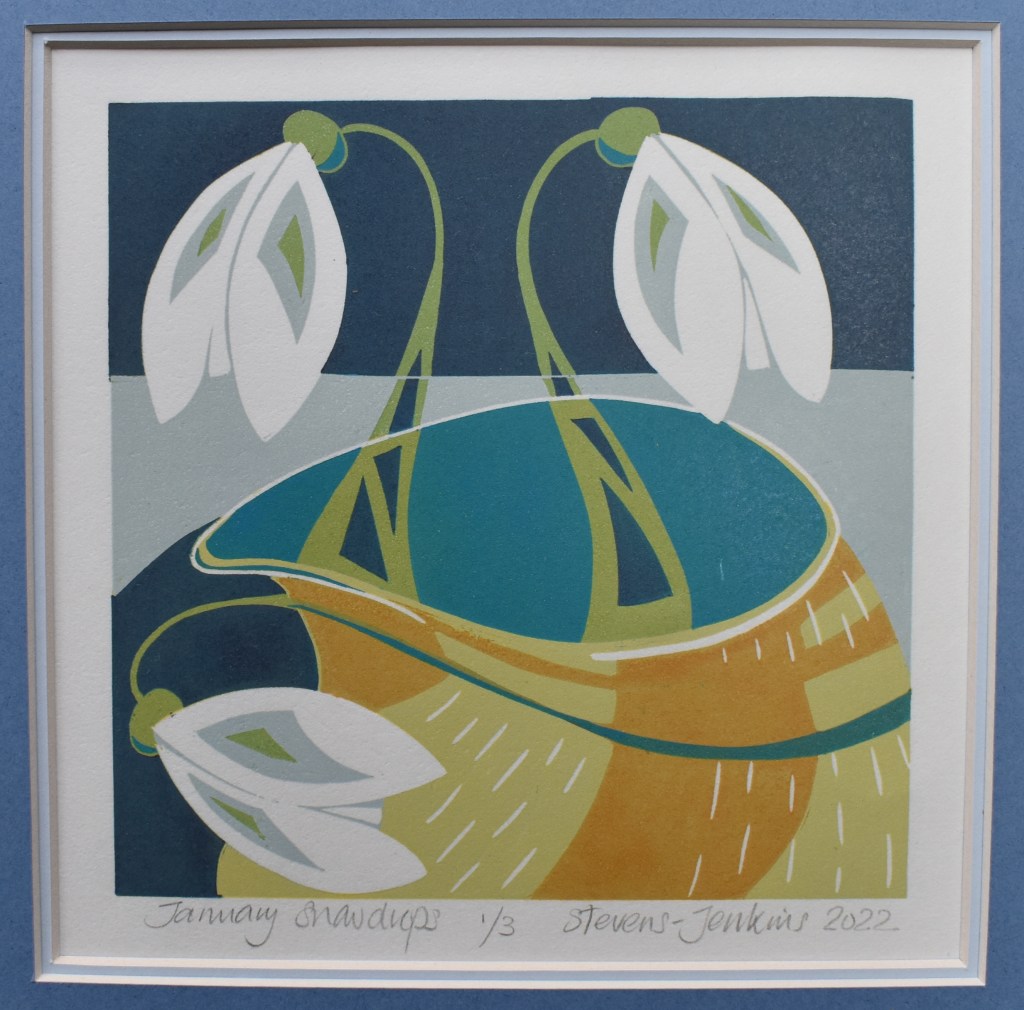 ‘January Snowdrops’ linocut by Susan Steven-Jenkins, 2022