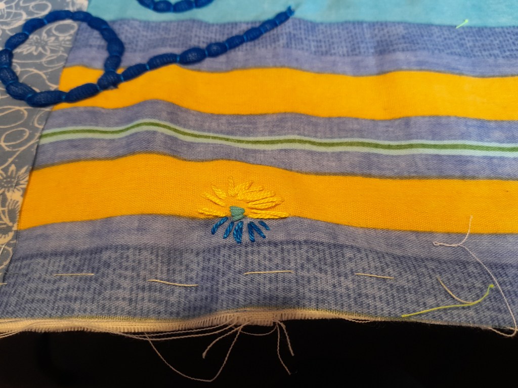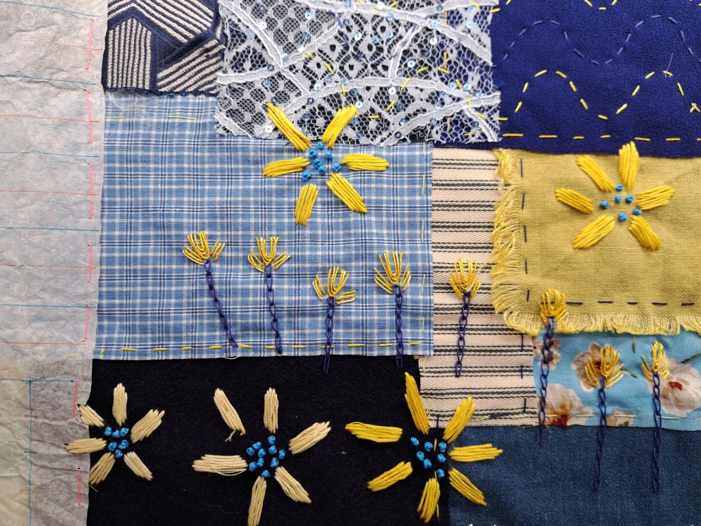 A lecturer stitches whilst her child is read to by her childminder nearby. Today people have travelled from afar to come to the group. It is humbling to have a participant from Ukraine journey into central Manchester especially to join us. A poet from Lancashire arrives. A teacher on vacation from Montreal stops by. My brain tries to recall some French words, but I feel too self-conscious to attempt to speak it in a group. The embroidery skills of the textile professionals are inspiring; the border benefits. Flowers are proliferating.