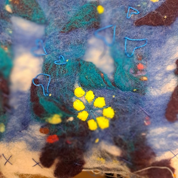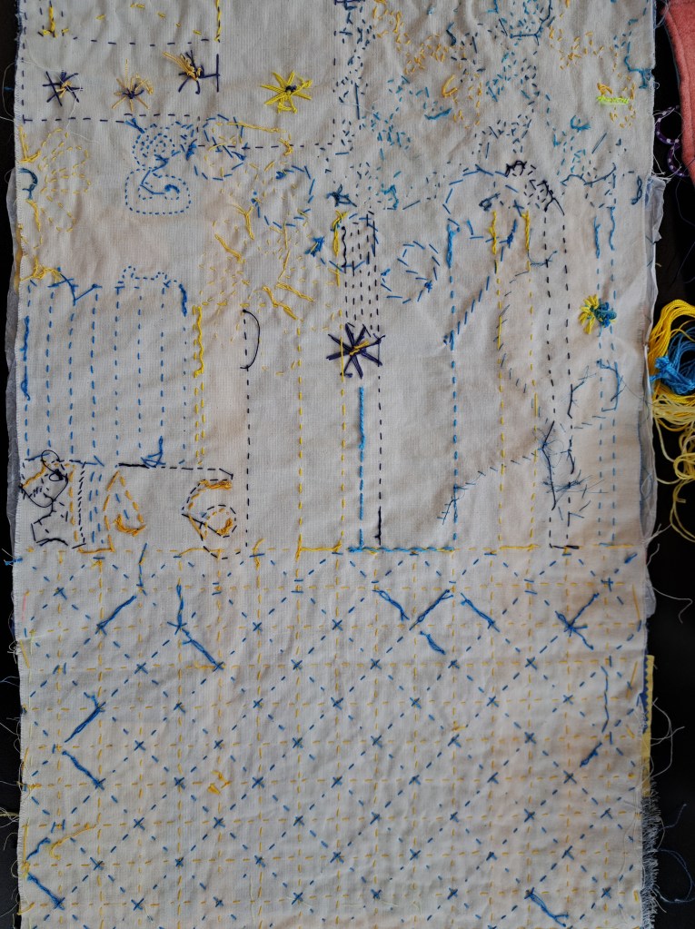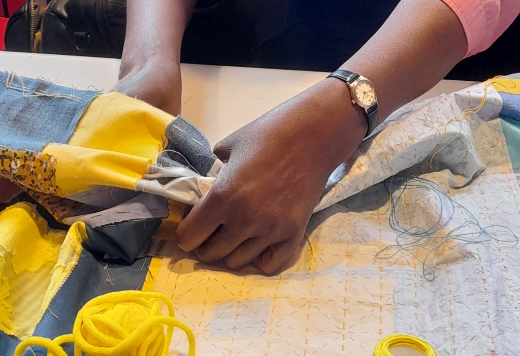 A reflective moment was when a participant explained she had deliberately stitched an open chain stitch. This gesture perhaps symbolising hopes for open borders and freedom. At this moment textile artist Alice Kettle’s (2022) recent inspiring words came to mind ‘Thread is a way you can transform the world and you have power’.