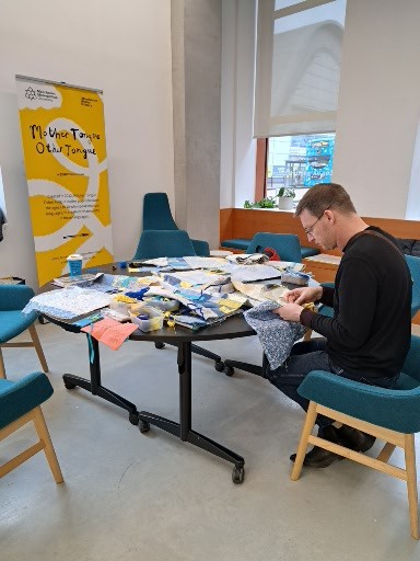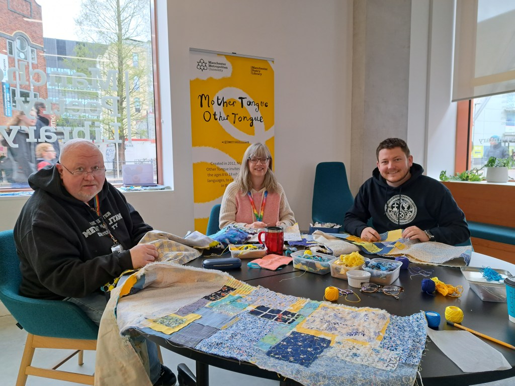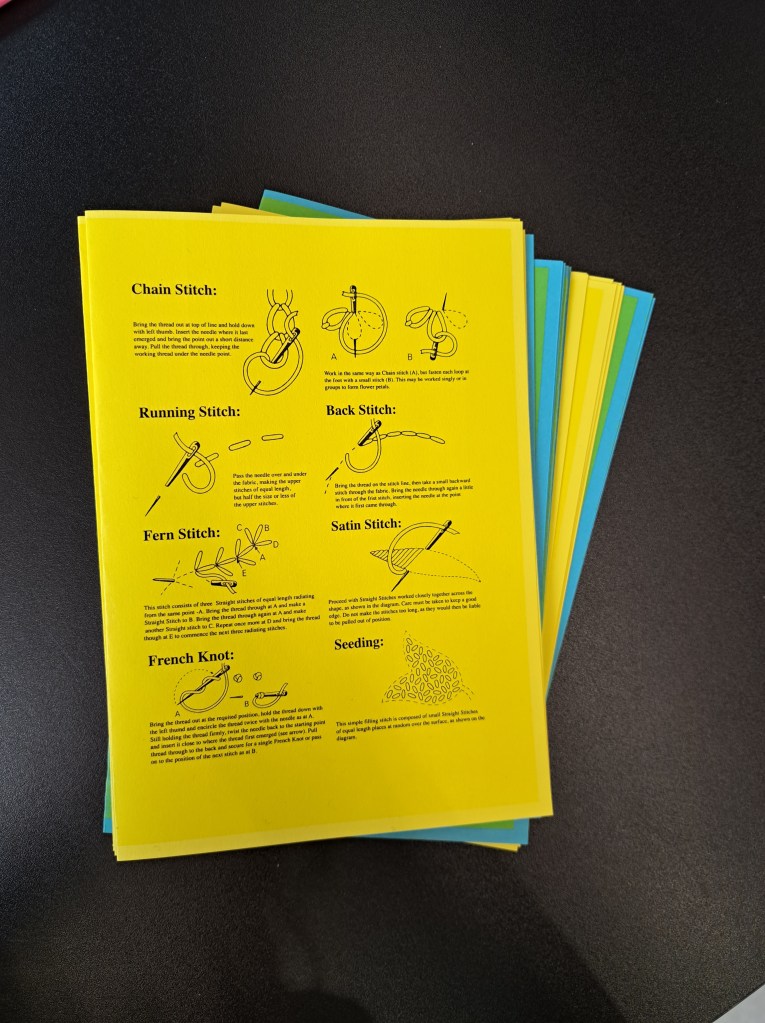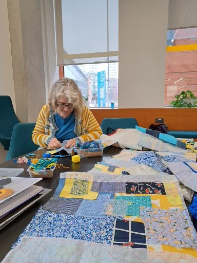 The university is buzzing again around us. There are four of us holding the session space today, Libby, Richard, myself and Mandy Tolley. Mandy has kindly volunteered to join us for the last three sessions and she persuades many colleagues to come along. She arrives with printed out stitch guides and her wonderful charm and enthusiasm.