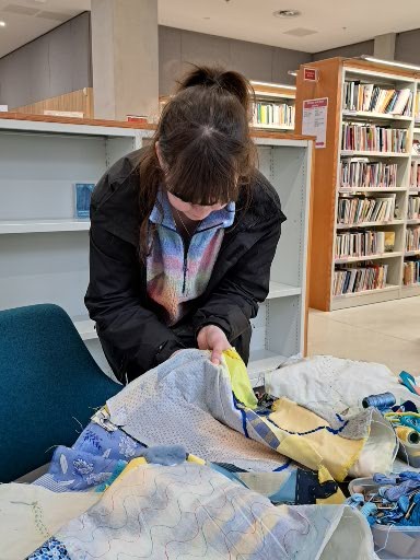 The border is starting to thicken with all the stitching into it, we also made new connections for places and people it might travel to next. Groups bustle into the Library on tours. I meet Kay Tew who is interested in our project and later puts me in touch with a Ukranian group in Sale.