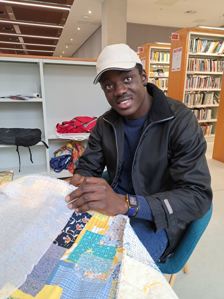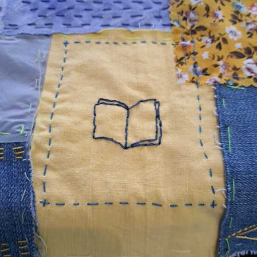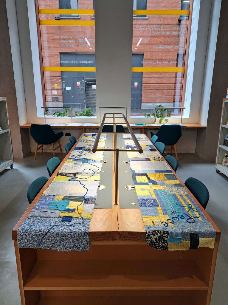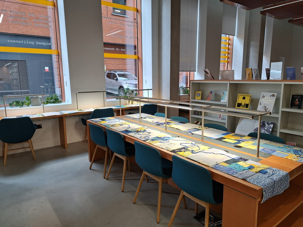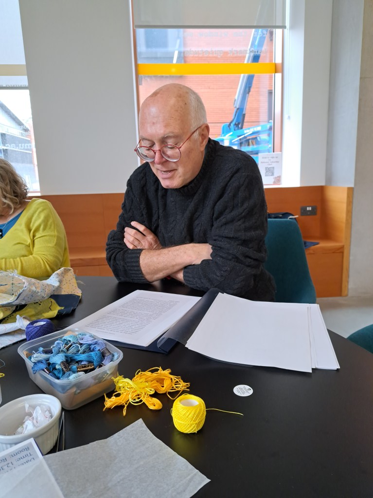 A lecturer pops in and makes an addition. The marketing team return making a film in the library. Their actor joins us to stitch on the border. Two passers by come in from the rain, a mum and her daughter. They are delightful company in spite of their terrible personal losses and NHS work experiences during the pandemic; a turn to embroidery has proven a sooth. Richard reads to us.