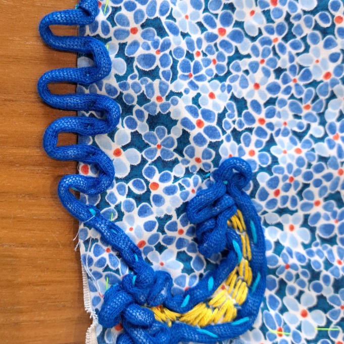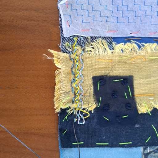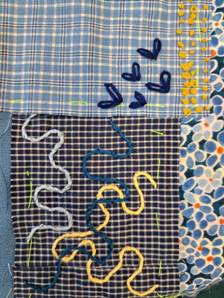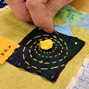 The border needs lots more stitching into although it is starting to have a lovely weighty feel between the hands. We think it would be good to take the border to other groups and are open to invitations! I want to add more wheatsheaf stitches – see Mandy’s examples below.