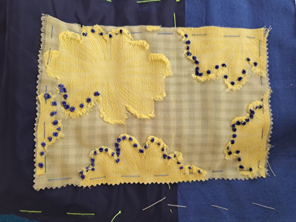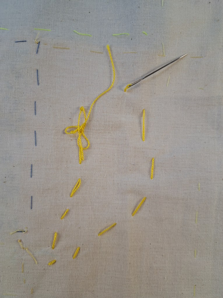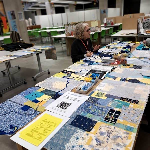 The first session was for one hour in a lunch break as part of the Symposium. We were thrilled that twenty-one people came to participate, at one point we had wondered if anyone would attend. The first task was to tack down the blue and yellow fabric snippets to the background pieces. We had divided the background into four, to be joined when entirely worked, so that it was easier for everyone to gather round. Each piece is 45 cm by 3.5 m. Some fabric pieces were donated from MMU’s Textiles Technician team who kindly helped me rummage through their cloth bins. Some threads, needles and pins came from the MMU Store. Prior to the workshop I had dyed some fabric pieces, also experimenting with dyeing with daffodil flowers.