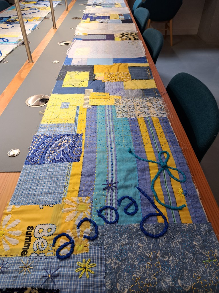 The invitation to the launch workshop on 19th May 2022: You are invited to join a workshop to stitch fragments of blue and yellow fabric to a long border strip using simple sashiko running stitch in the tradition of the ancient craft of Japanese boro (patchwork). We are working loosely to the colours of the Ukraine flag. All materials, needles, instructions, and assistance will be available but please bring along any personal patches of blue or yellow fabric or thread that you may like to add. Boro tends to be in rectangles or squares and can be very small. Additionally, or alternatively (if you are not a stitcher), you are invited to bring along a short piece of writing about thoughts of the border, your own or something you found. These can be read out whilst the stitchers stitch. The art piece will then travel over the next few months to various community centres in the country to be added to by local groups. A book will be available to document your contribution – this can be your name and any piece of writing you may wish to be shared with other groups as the piece travels.