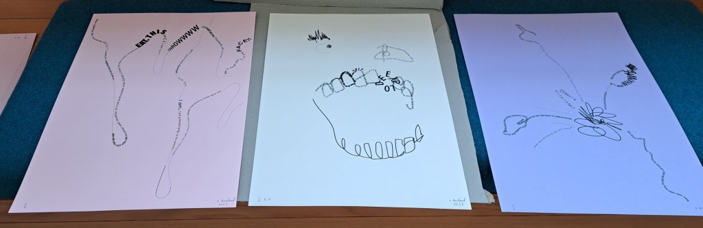 Kate stops by, she is taking a break from working towards her final degree show in Fine Art. A colleague Liv pops in to drop off three prints with me for an upcoming exhibition. They are delicate poem/line drawings, perhaps a form of concrete poetry. Kate helps us decide which order they should be hung in.