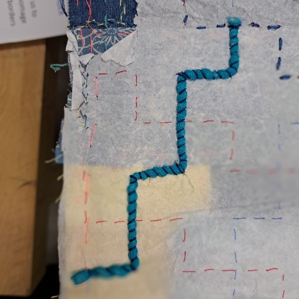 Darren drops in, he likes the border project and describes it as ‘sewing the world together… stitch by stitch, person by person’ and also of stitch ‘as a medium of healing’; he is happy for me to reuse his poetic words. He stitches a space that is open, this feels like a way to break borders. He leaves the needle caught having run out of thread to fasten off, it suggests it’s not possible to make a permanent fixing to the ground. I think of border crossings and migration and impermanence, people here in Manchester too, constantly on the move.